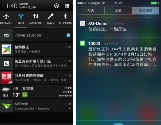 在信鸽产品中,通知定义为Android和iOS开发者指南中的Notification。服务器定向将信息实时送达手机,通过建立一条手机与服务器的连接链路,当有消息需要发送到手机时,通过此链路发送即可。
