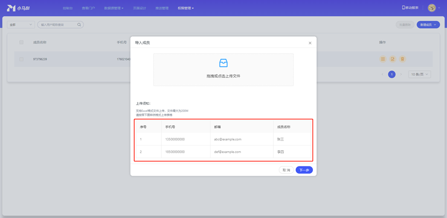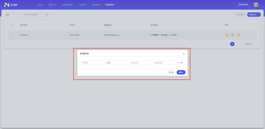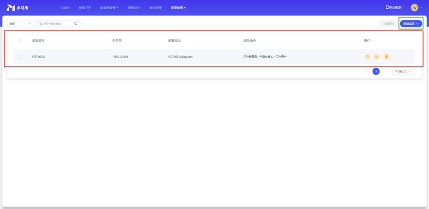 成员管理界面可显示所有成员,并显示基本信息和角色归属。点击右上角新增成员可添加新成员。