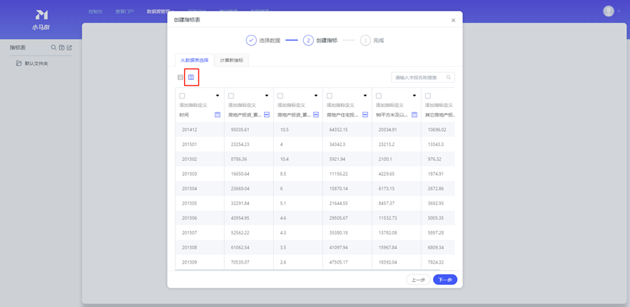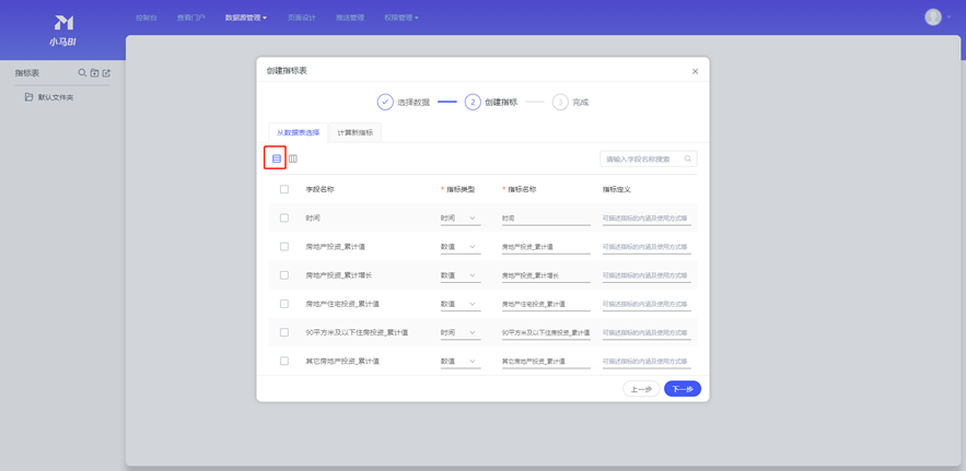 选择需要的字段,同时可对各字段的指标类型,指标名称,指标定义等进行编辑。