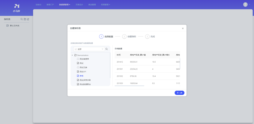首先选择数据源,后续的指标表将基于此数据源建立。对话框右侧会显示该数据源的数据预览。