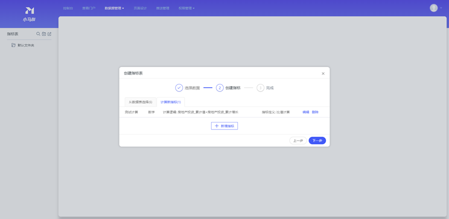 创建指标分两种,第一种为直接从该数据源中选取字段形成,第二种通过为字段间创建计算逻辑形成新的字段。