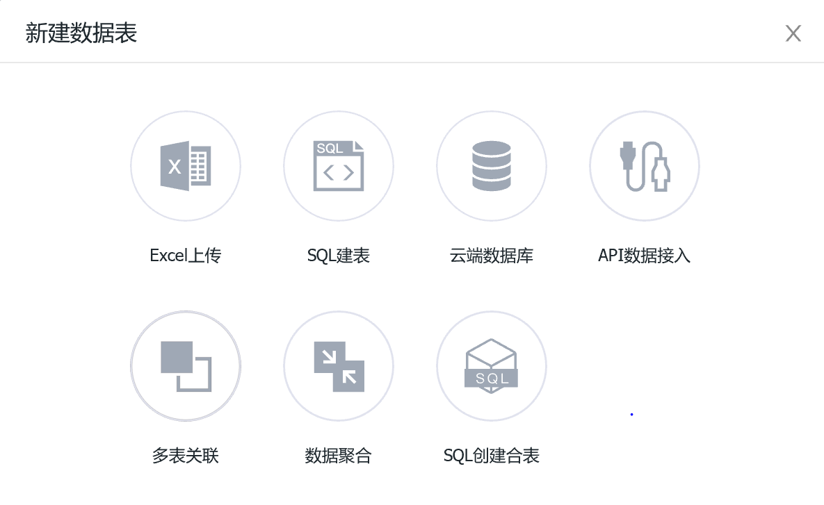 - 点击创建数据表将会进入添加新的数据表到此门户数据源的过程。如图,目前我们提供了七种添加数据表的方式。