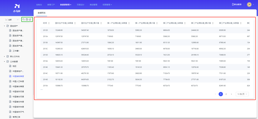 我们会默认在用户的每个门户里添加一些公共数据表作为初始数据源。用户可使用这些公共数据表进行报表制作的尝试并了解图表的配置等过程。