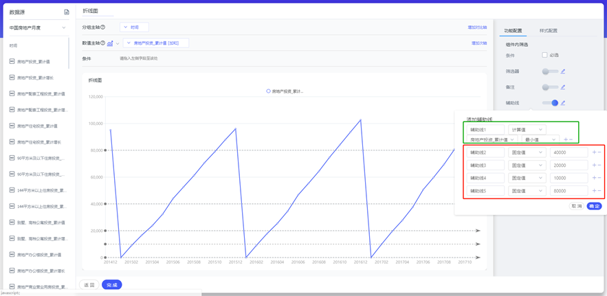 可以设置多条辅助线,或者以最大值,最小值等条件直接标注辅助线。如下图绿色区域内为直接设置最小值标注和红色区域内多个固定值标注混合。