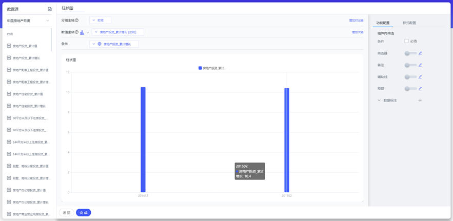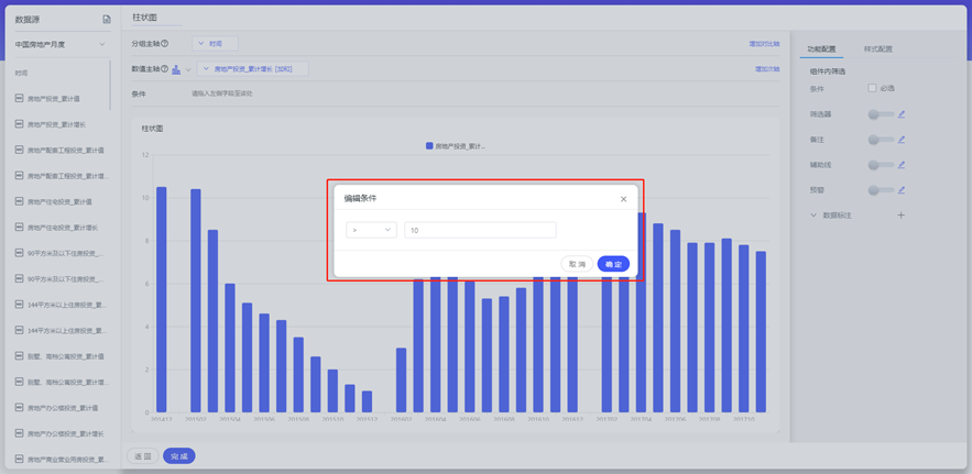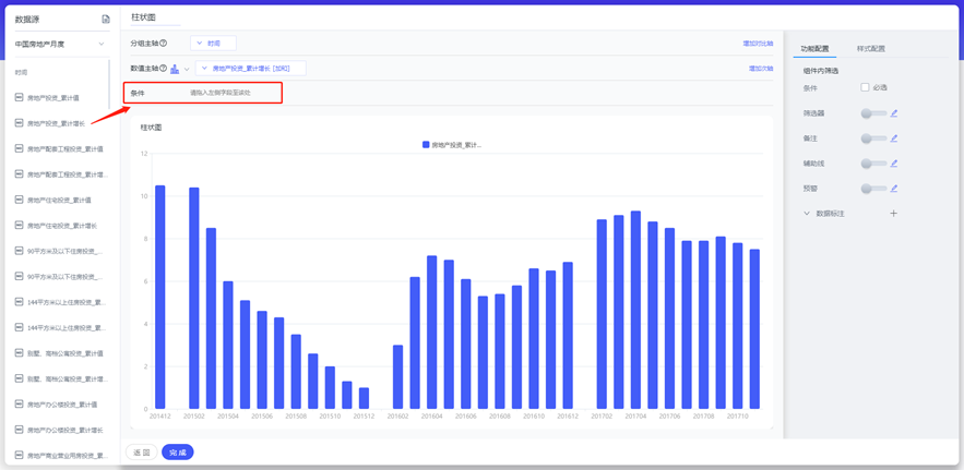 如图,我们的数值主轴是“房地产投资_累计增长“,所以我们筛选的对象就是该字段,将该字段拖入右侧”条件“栏。