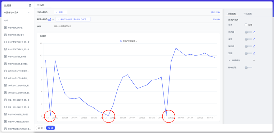 我们以下面这张折线图举例,红色标注三个部分的数据较为极端,跌落在谷底。