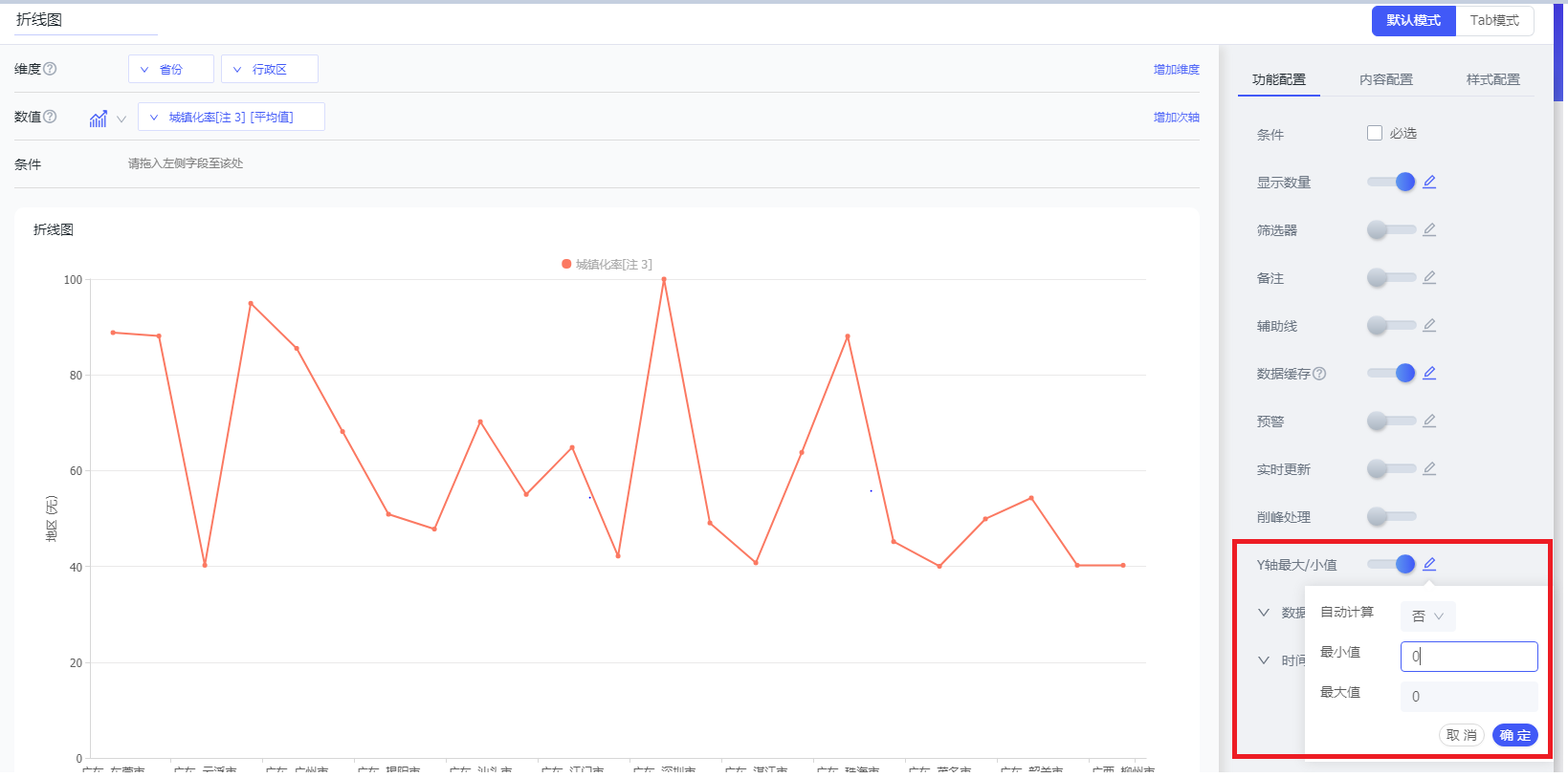 为了展示的方便与美观,用户可以自定义坐标起始轴。用户在进入页面设计后,可以在右侧工具栏的功能配置中,设置坐标轴的起始点。