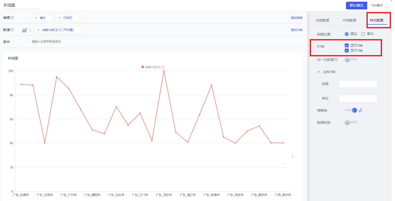对坐标轴的配置包括:选择是否展示坐标轴、设置坐标轴的标题和单位。