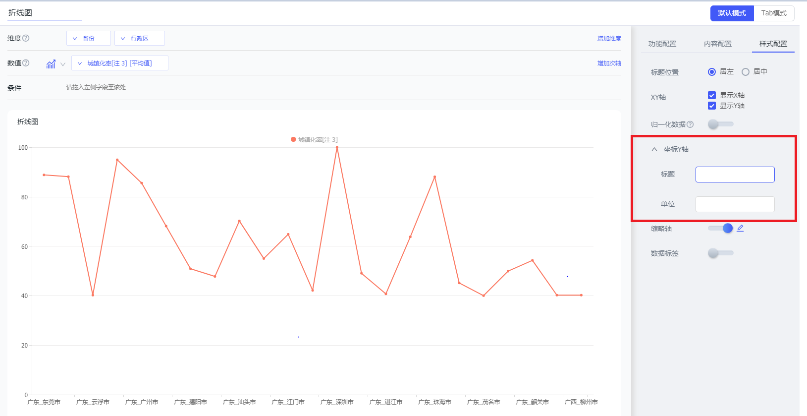 进入页面设计后,可以在右侧工具栏的样式配置中,设置Y轴的标题及单位。