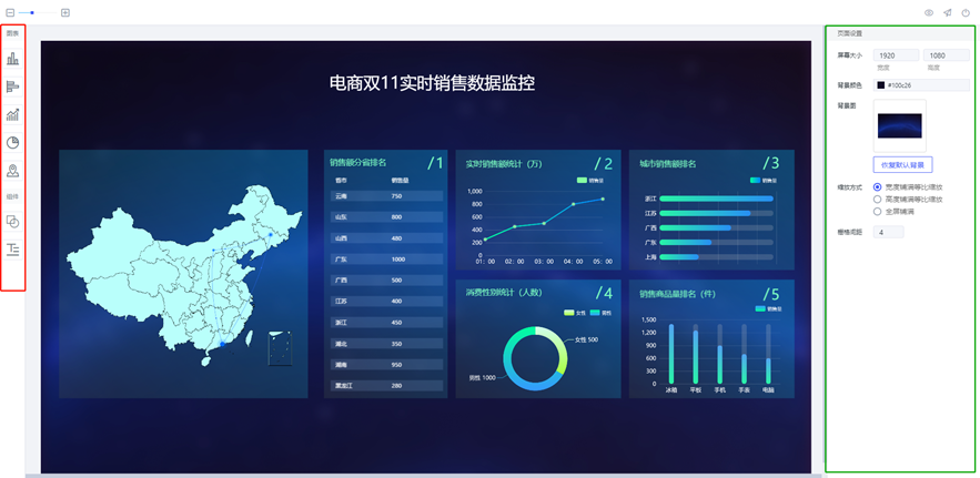 创建项目后会进入大屏专有的操作面板。左侧红色区域内为目前大屏支持的图表和组件,右侧为编辑栏。