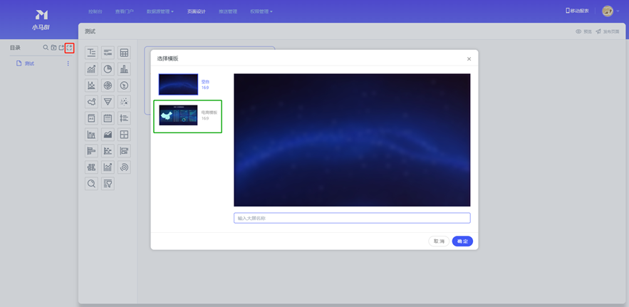 与报表一样,大屏采用了拖拽创建图表组件的方式。鼠标悬浮于左侧图表类型后,会显示该类型下的图表细分,选择其中一种并将其拖拽入画布即可创建。
