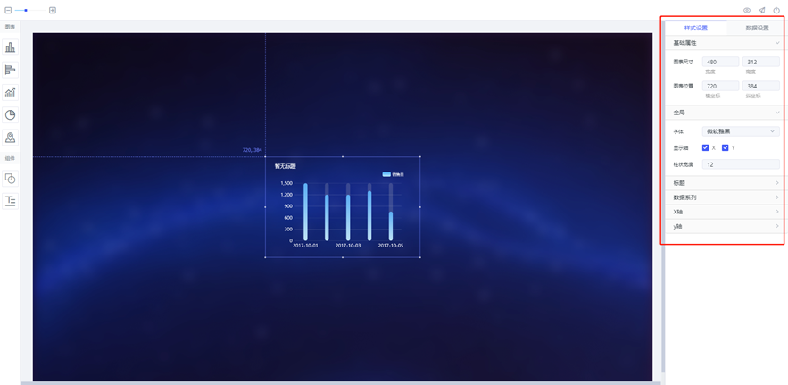 用户可对图表在画布中的位置,图表的大小,图表的字体,颜色渐变等多种属性进行修改。