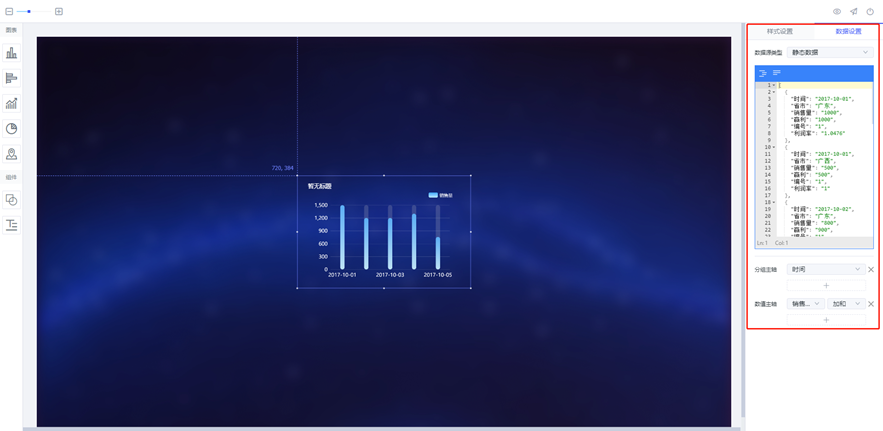 数据设置上,在拥有报表所支持的所有数据源基础上,大屏额外支持了静态数据。每一张图表会有默认的静态数据文本,用户可根据自己需要重新写入。